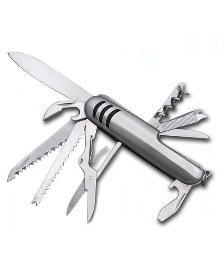 11 Functions Bottle opener Can opener Flat head screwdriver Corkscrew Star screwdriver Pair of scissors 2 Small knives Large knife 2 Saws